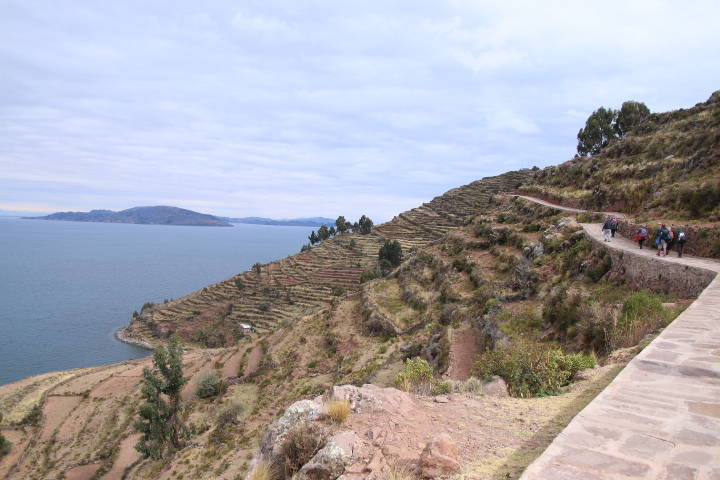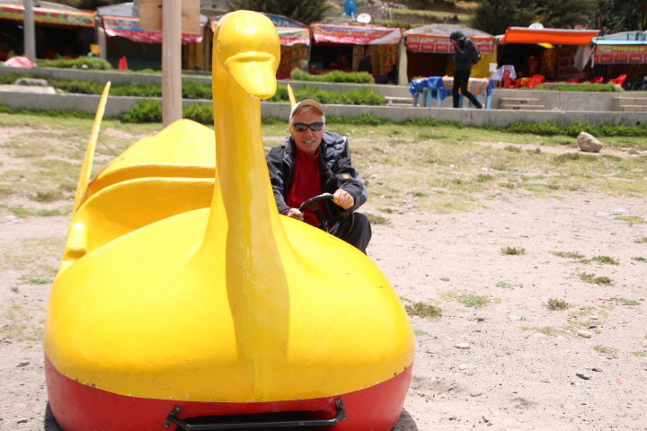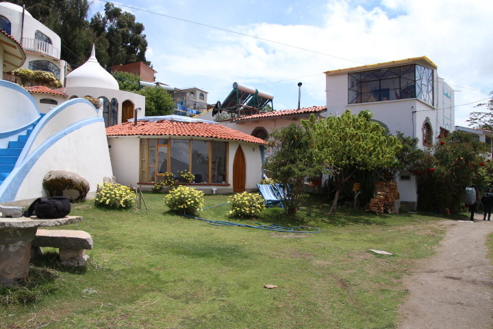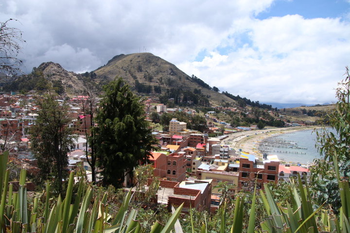 La route empruntée entre la frontière et Copacabana est jonchée de nids de poule. Notre chauffeur zizague sur la route pour éviter les chocs. Notre hôtel jouit d’une jolie situation sur la colline dominant le lac.