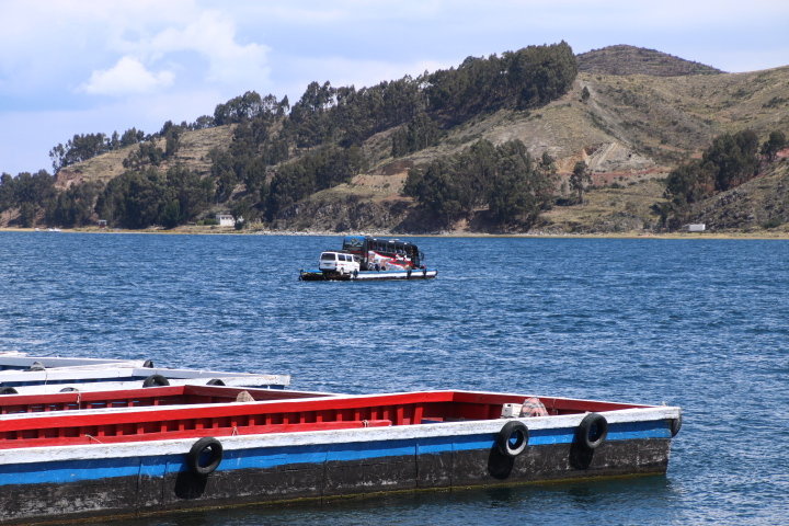 Notre bus sur une barge pour une traversée du lac vers Tiquina