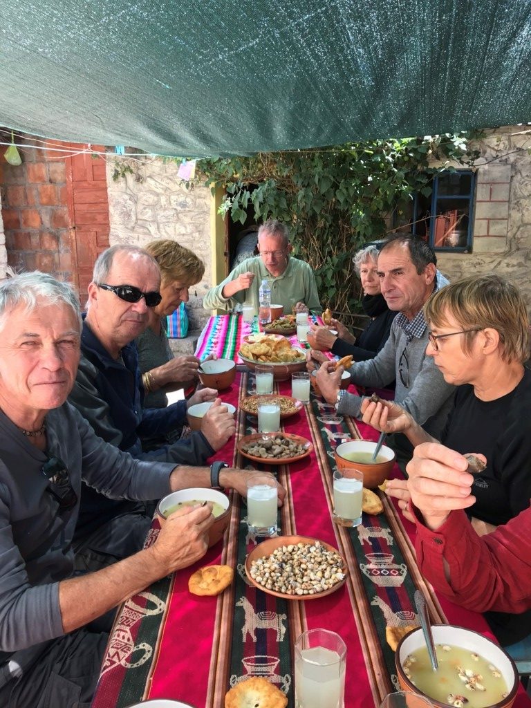 Nous sommes chaleureusement accueillis, notamment par l’homme de la maison. Nous déjeunons d’une soupe accompagnée de différents mets traditionnels.
